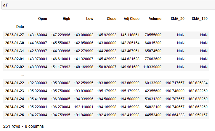 Następnie dodajemy dwie nowe kolumny do naszej ramki (tabeli) danych i jest to SMA_30 i SMA_120. Do policzenia SMA dla interesującego nas okresu 30 i 120 dni wykorzystujemy funkcję "sma()" z biblioteki "pandas_ta" oraz wartości z kolumny "Close" zawartej w naszych danych.